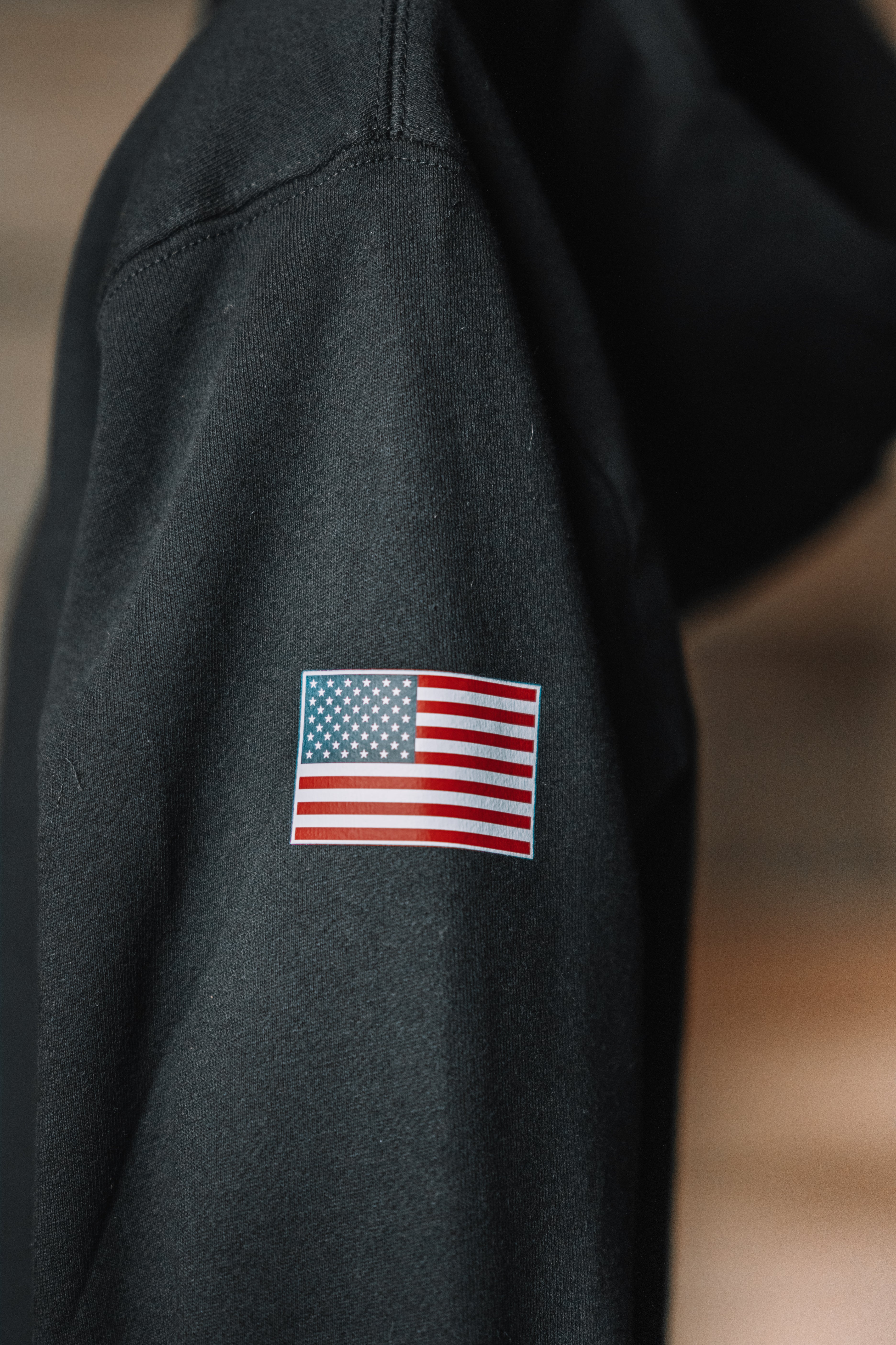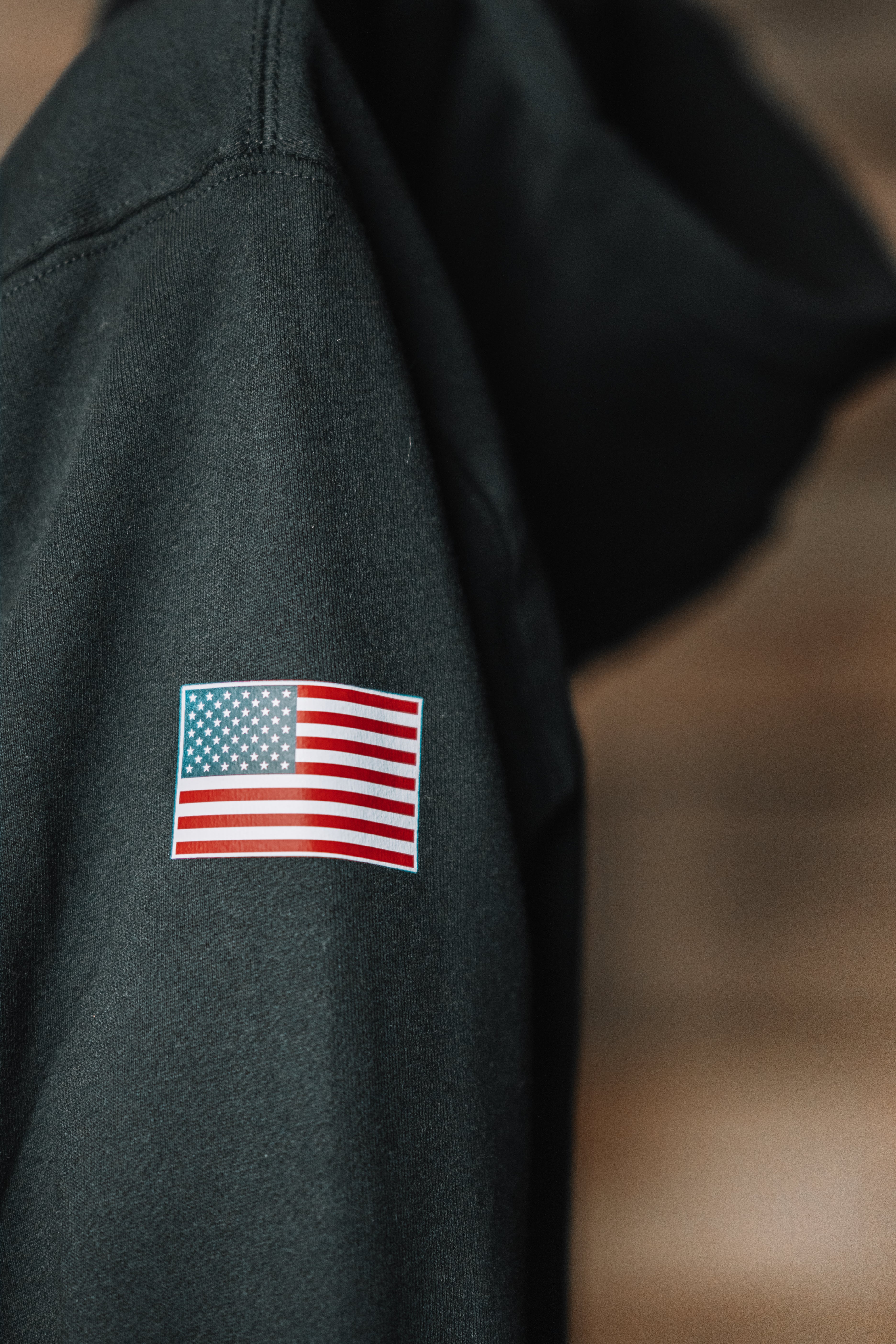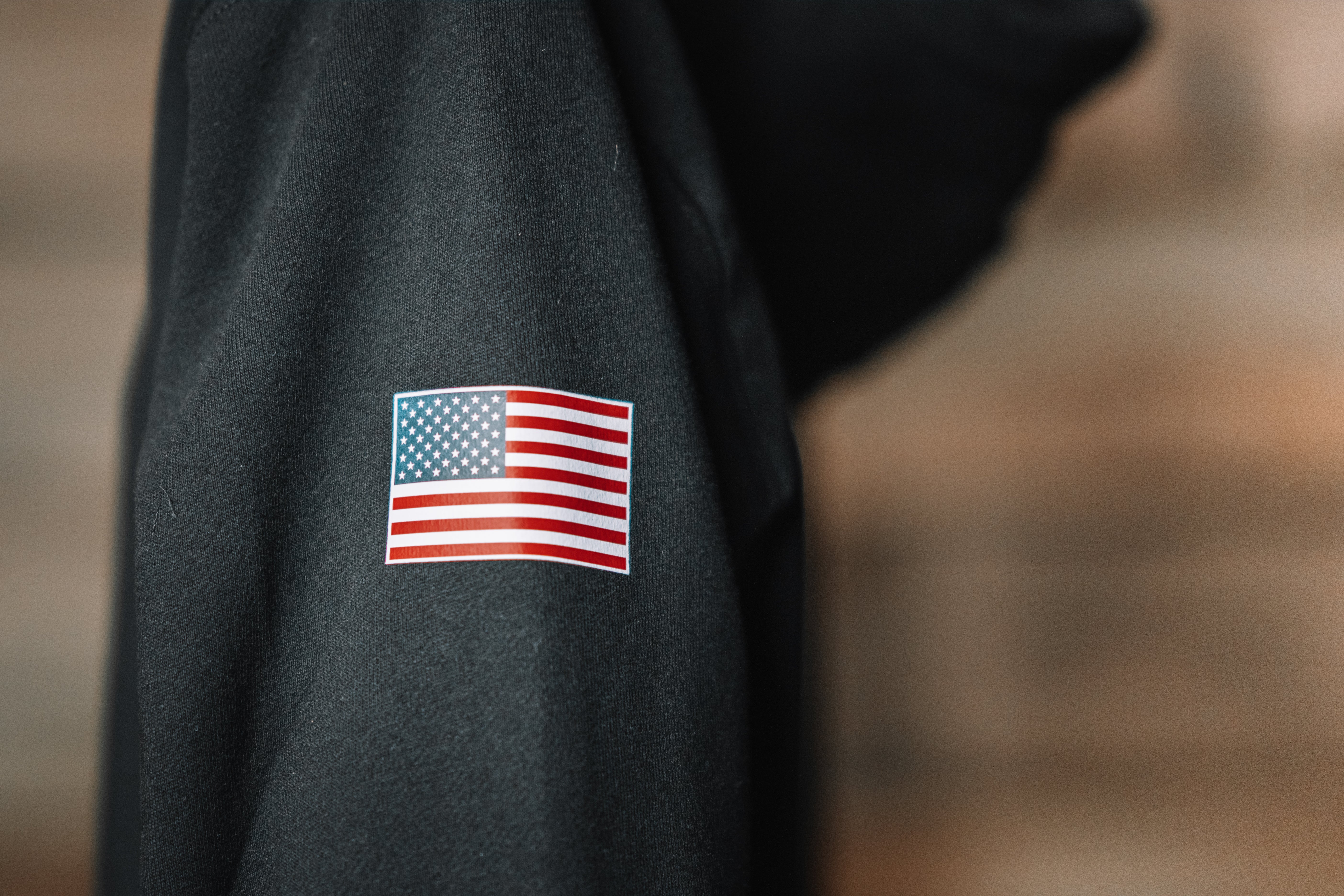 A spacious front kangaroo pocket adds functionality, while the adjustable drawstring hood provides customized warmth. Subtle sleeve details—including a small American flag patch—add a touch of character without overwhelming the clean look.
